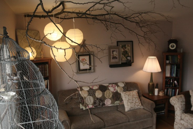 We LOVE our huge window and can’t wait to get new blinds and curtains. I’m thinking just long drapes for decoration, nothing to block any of the light. The quilt on the couch is not home-made, it’s from Wal-Mart from a long time ago. Sorry…I don’t shop there anymore. The branch, complete with authentic moss, is from my parents’ woods. Henry was kind enough to strap it to the top of our Volvo and drive it home for me where I fought it up the stairwell and tied it with twine to hooks screwed in the ceiling all by myself. It wasn’t that heavy, just unweildy. Funnily enough, no one stirred outside their door to ask me what in the world I was doing with that branch. Or for that matter, to be poked in the eye or mangled by a surprise branch in their face. It was so worth all the work, though. It makes us feel like we’re sitting under a tree.