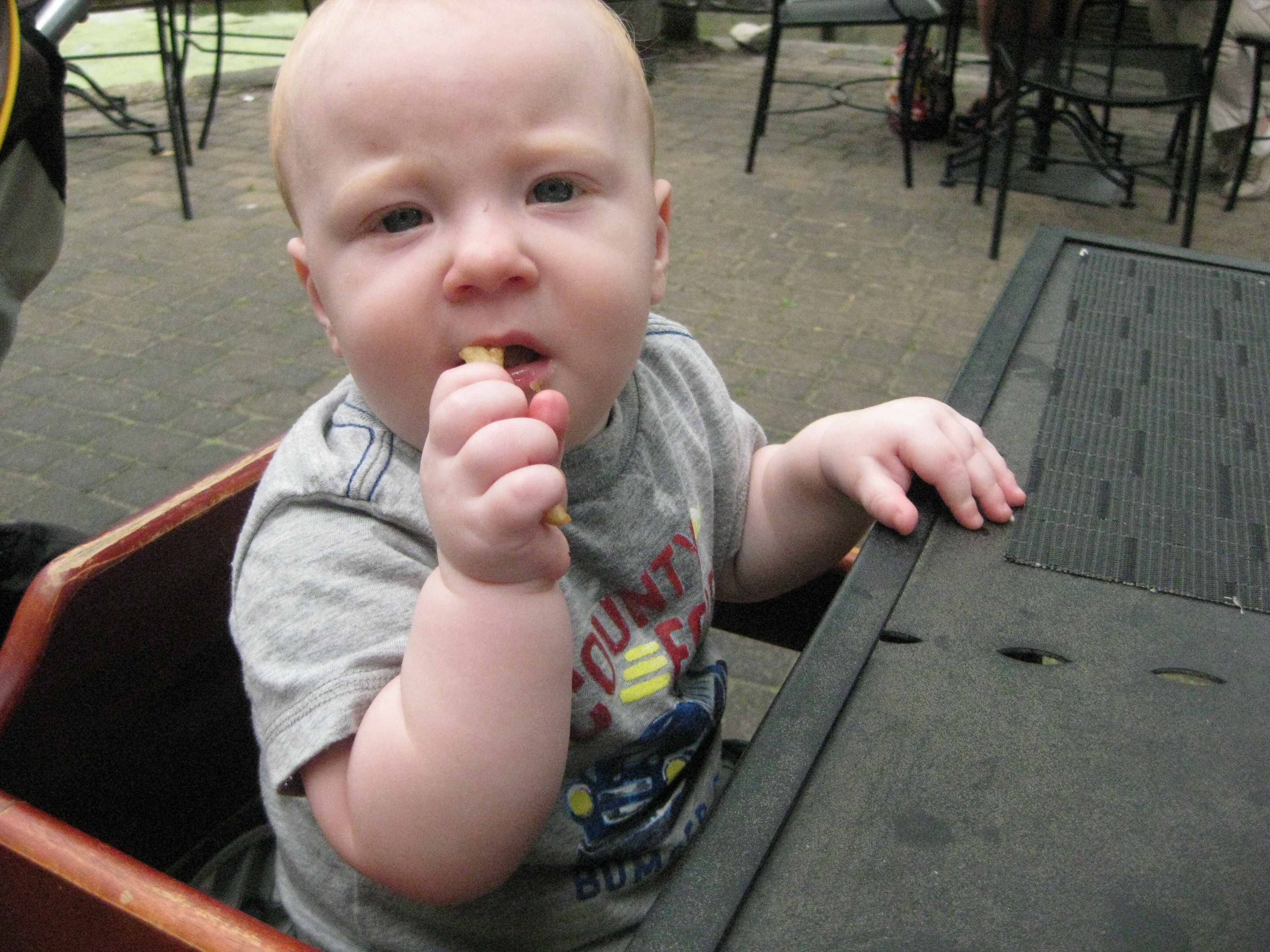 happy. This is Piggle eating his first french fry. I’ve recently been worried that he’s not getting a lot of vegetables – this was not an exception in case you were wondering; just a way to keep him occupied during lunch – so I bought some jars of baby food peas and green beans. Did he like them? Not in the least. In fact, he gagged. Sigh. Again.